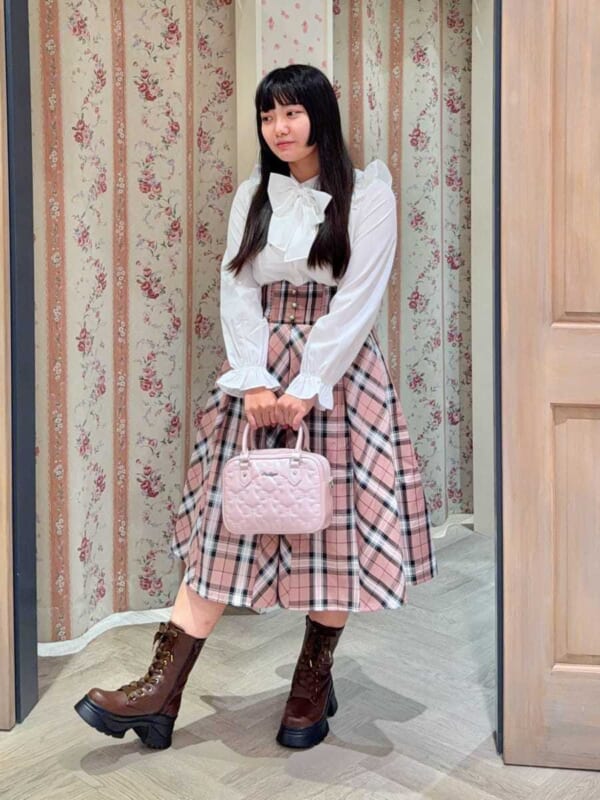白のブラウスに、ピンクチェックのハイウエストスカートを