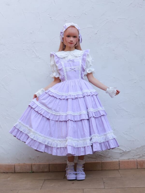 チェック付け衿×丸襟チェックワンピースに、フリル切替ティアードスカートをペチコート代わりに合わせました。