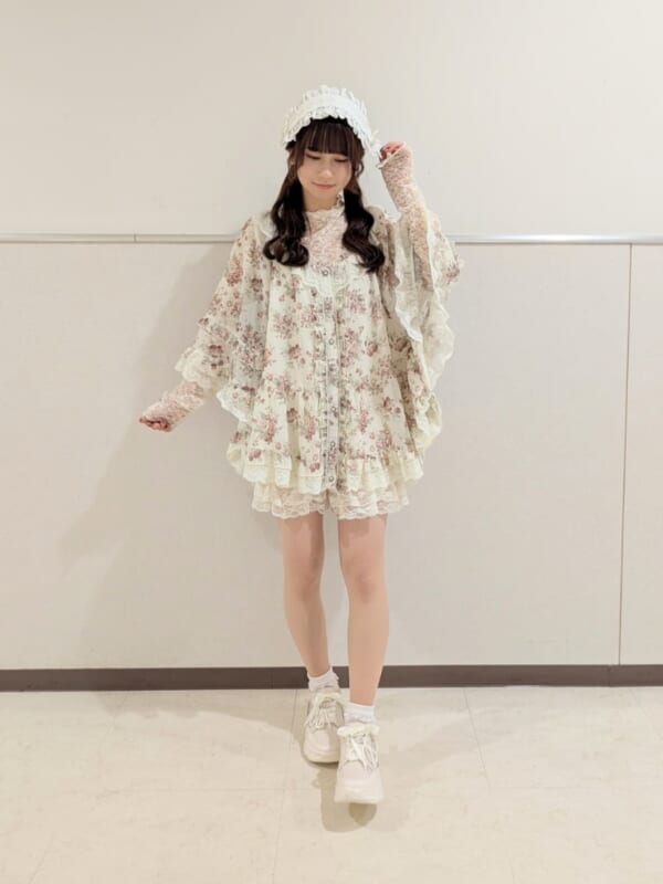 落ち着いた色味ですがレースがたっぷりで、大人っぽさの残る可愛さがあります。