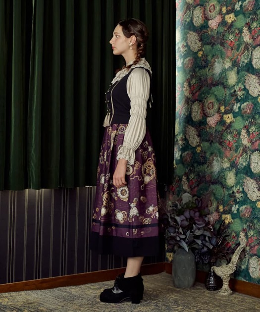 時計や歯車などのスチームパンク風のモチーフを落とし込んだアンティークな柄のジャンスカです。