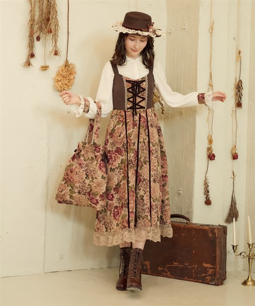 エプロンをイメージしたジャンスカは、繊細なレース使いやピンタックなど、細部までこだわったディテールを施しレトロな印象に。
