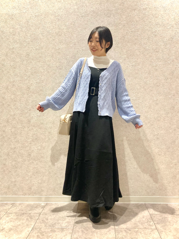 肌寒い日は淡い色のアウターやカーディガンを羽織ると、ひと足先に春を感じる装いに♪