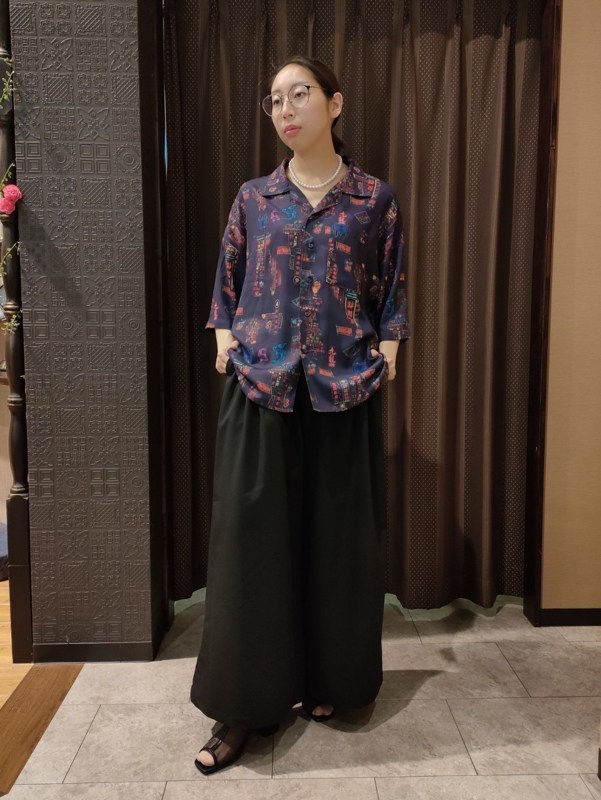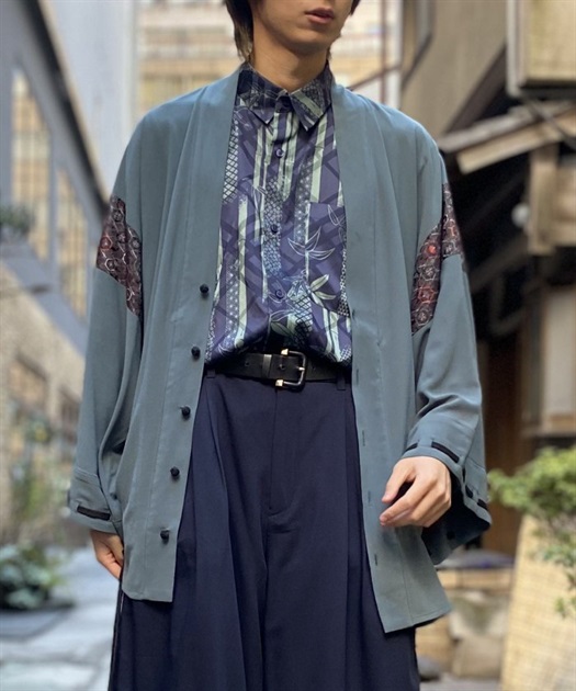 縮緬のような素材と着物スリーブがお洒落なシャツに、チャイナボタンがアクセントの羽織、袴風のパンツがとにかく個性的で素敵です。