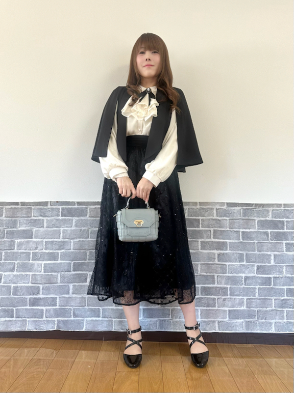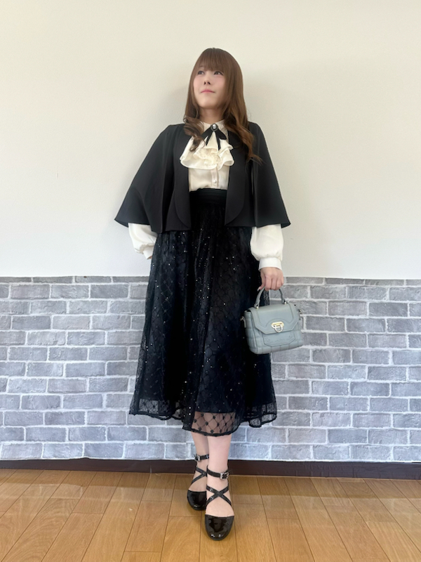 シンメトリーなヘムデザインのシルエットがキレイなケープ風ボレロは、