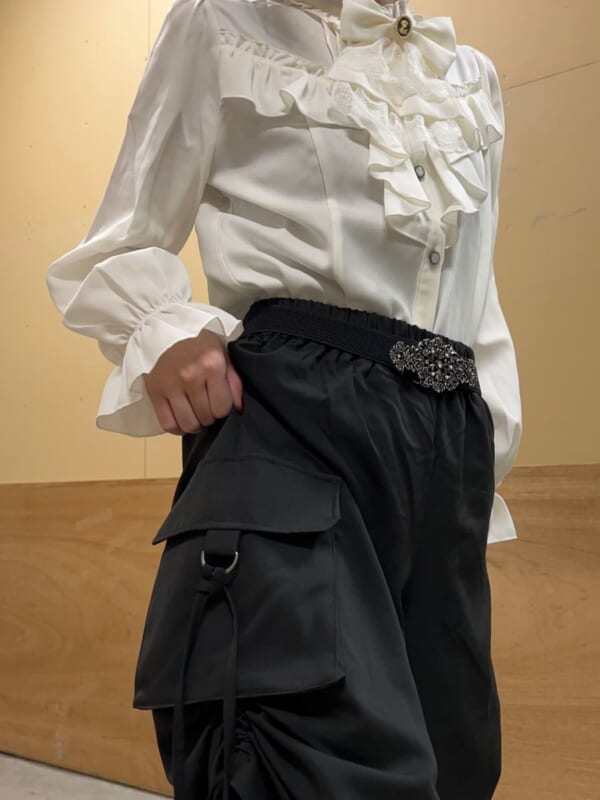 カジュアルエレガンスにおすすめのブラウス|リボン×ジャボブローチ付ブラウス