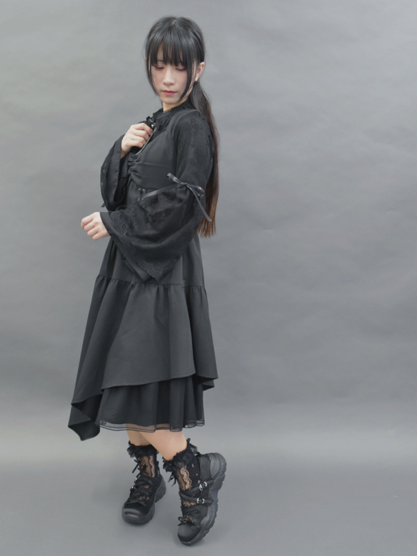 ウエストのコルセット風レースがップが特徴的な、長袖アシメワンピースです♪