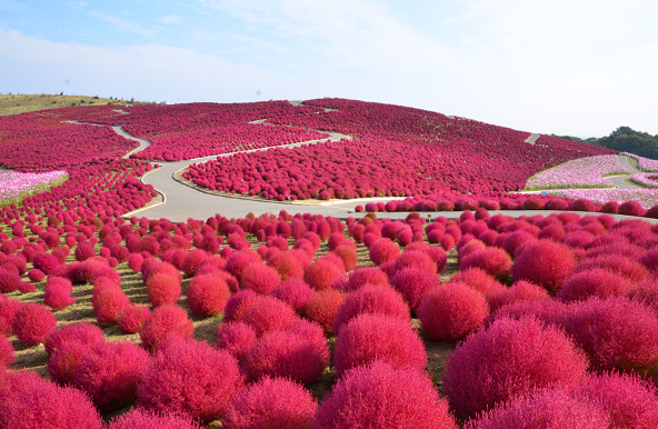 国営ひたち海浜公園のみはらしの丘では、コキアの華麗な紅葉が見られます♡