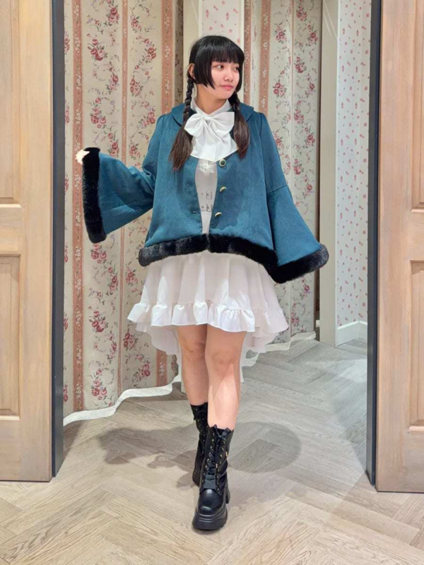 ベルスリーブのアウターとふんわり広がるスカートで、魔法少女のようなシルエットに♡