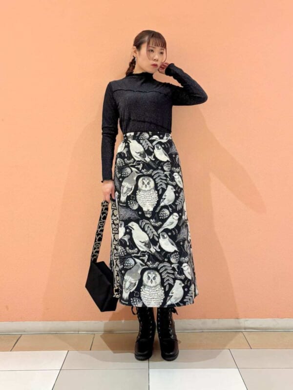 野鳥モチーフのゴブランスカートは、個性的な柄ながらもゴブランの重厚感が上品な印象。