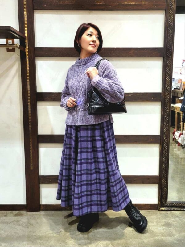 ボルドーのスカートを合わせると、ぐっと季節感のある大人な印象に!