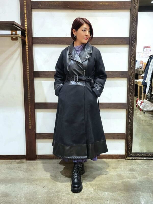 アウターは、レザーの切り替えが入ったモードな印象のコート♪厚手の物を着てても着れるサイズ感でした。