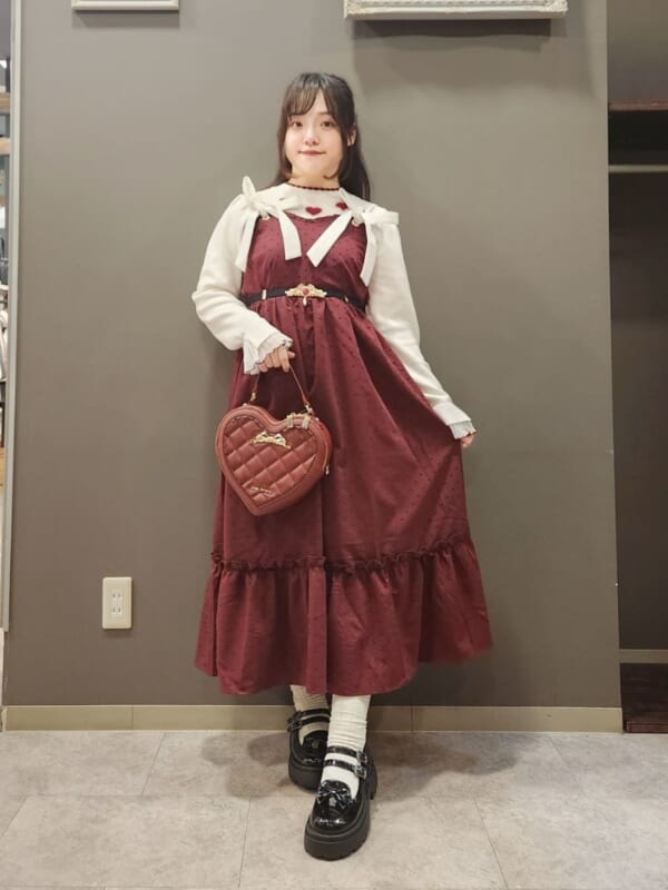 ワンピースはフロッキープリントのハートドット柄が可愛いジャンパースカートです!