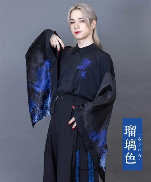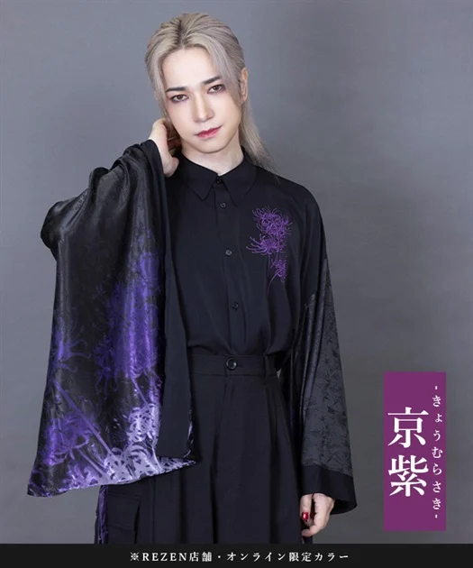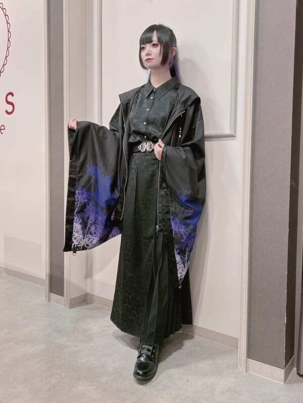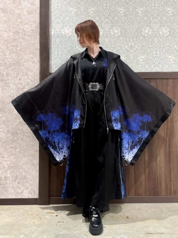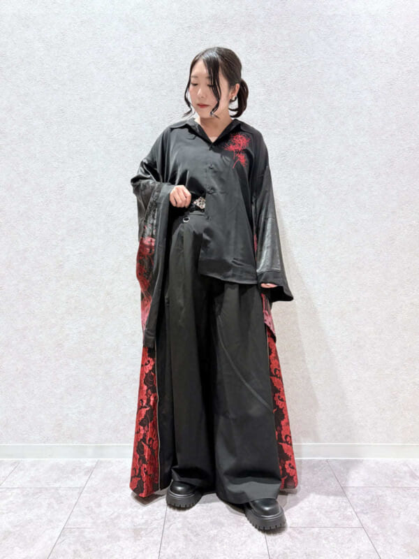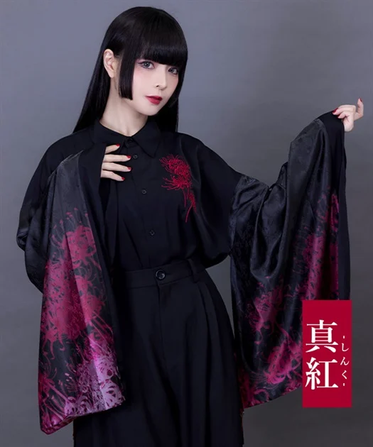 大ぶりな和袖に施されたプリントと、胸元の刺繍が彼岸花の咲き乱れる神秘的な光景を表現しています。