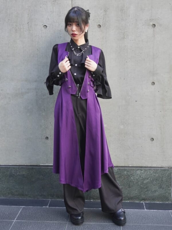 一癖あるデザインで、シルエットが美しいロングベストがラインクイン。