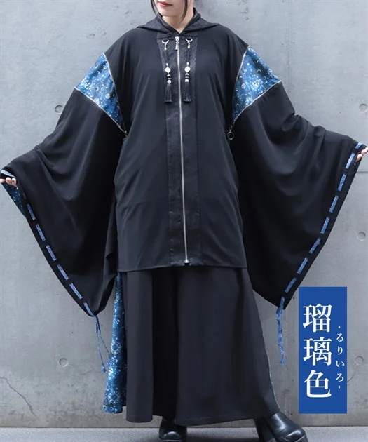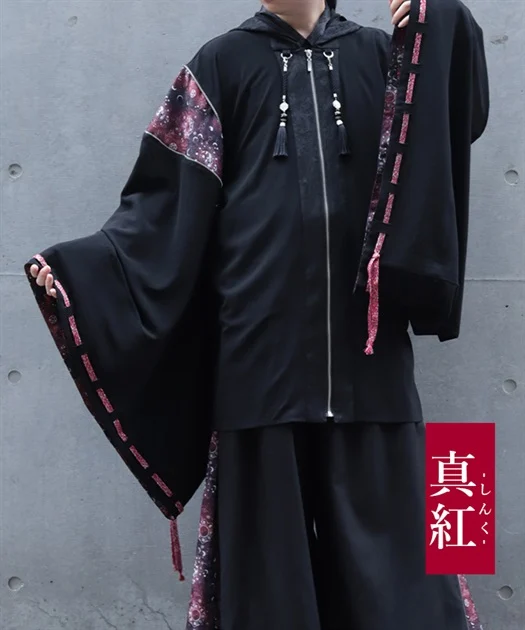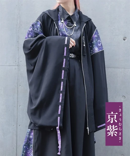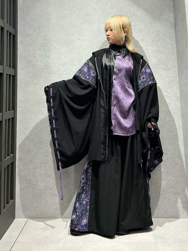 ジッパー仕様の肩の切替や袖括りなどのディテールは、陰陽師の装束である狩衣を再現しています。