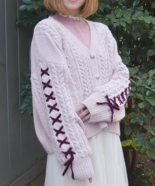 ケーブル編みと袖に大きくあしらったレースアップがアクセントになり、人目を惹くこと間違いなし♡