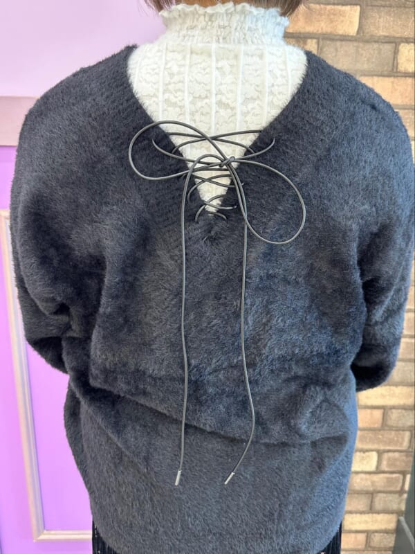 バックスタイルのレザーリボンは甘くなりすぎない大人なデザインです