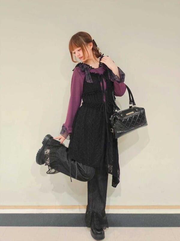 真っ黒コーデに差し色💜