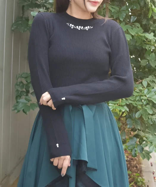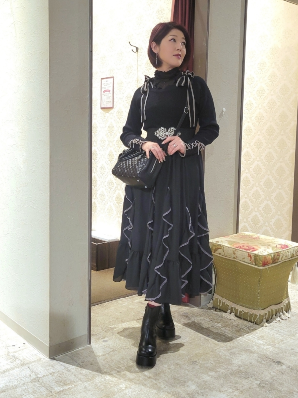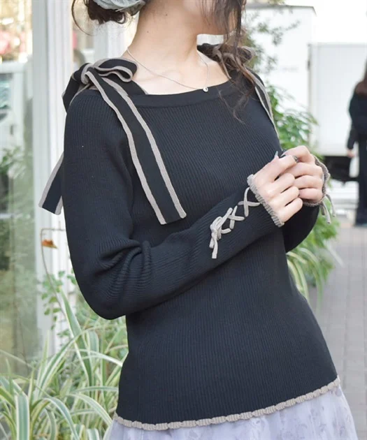 ショルダーリボンニットの程よい甘さに、シアーフロッキーインナーを重ねることで、黒コーデでも奥行きと表情が◎