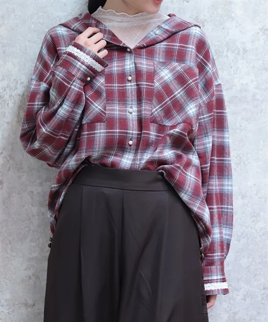 フード付きのオーバーシャツは、ラフな印象がありつつも、カフスのレース使いやパールボタンでほんのりフェミニンに♪