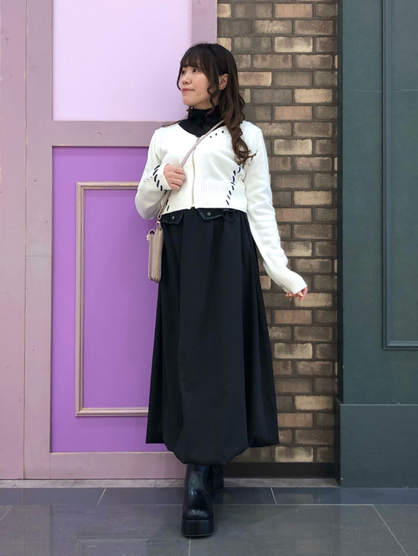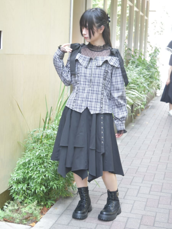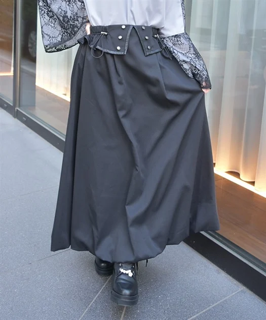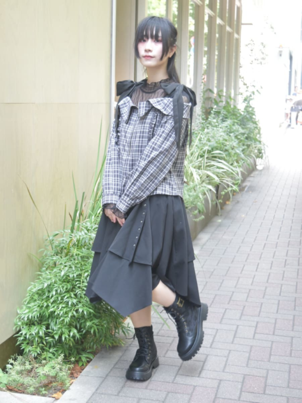 ボリューム×アシメヘムスカートを合わせることで、フェミニンさの中にほんのりパンクなムードをプラスしています◎