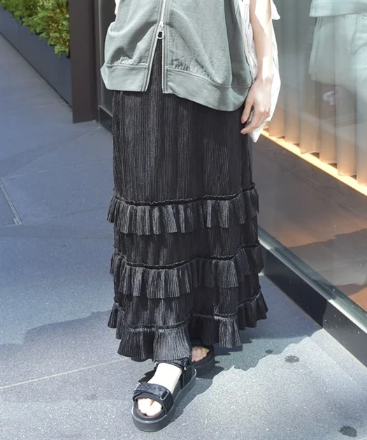 ボトムには、縦ラインを強調するプリーツ×裾フリルのスカートをセレクト!