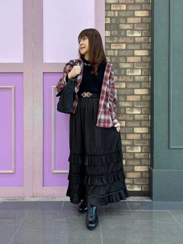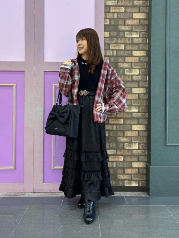 目を引く赤のチェックシャツを主役に、ブラックのカットプリーツフリルスカートを合わせた、メリハリのある大人カジュアルスタイル♡