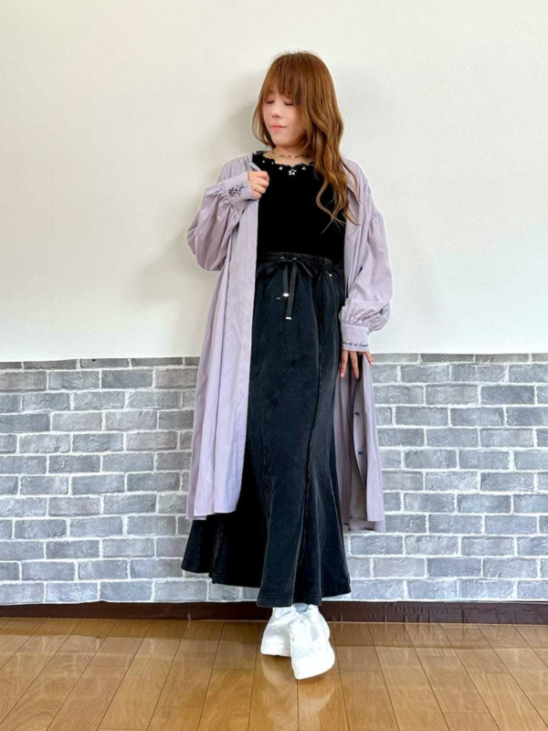トップスのフリルや蝶チャーム、スカートのチェーンやハトメなど、ディテールに個性が詰まっているから、色味を揃えるだけでスタイリングが成立するのも嬉しいポイント♡