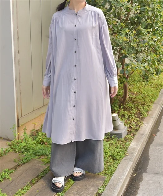 さらっと羽織った生成りのロングシャツが主役の、抜け感たっぷりなスタイリング♪
