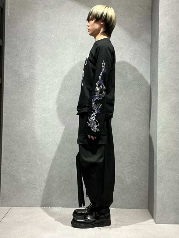 ロンTはMサイズでも袖が長めになっていますが、スリムなシルエットを演出してくれるので、裾幅が広いズボンと相性抜群です。
