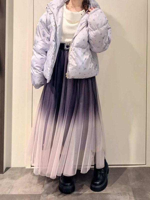 今回は刺繍ニット×ラメチュールスカートに合わせて、とことん甘くスタイリング。