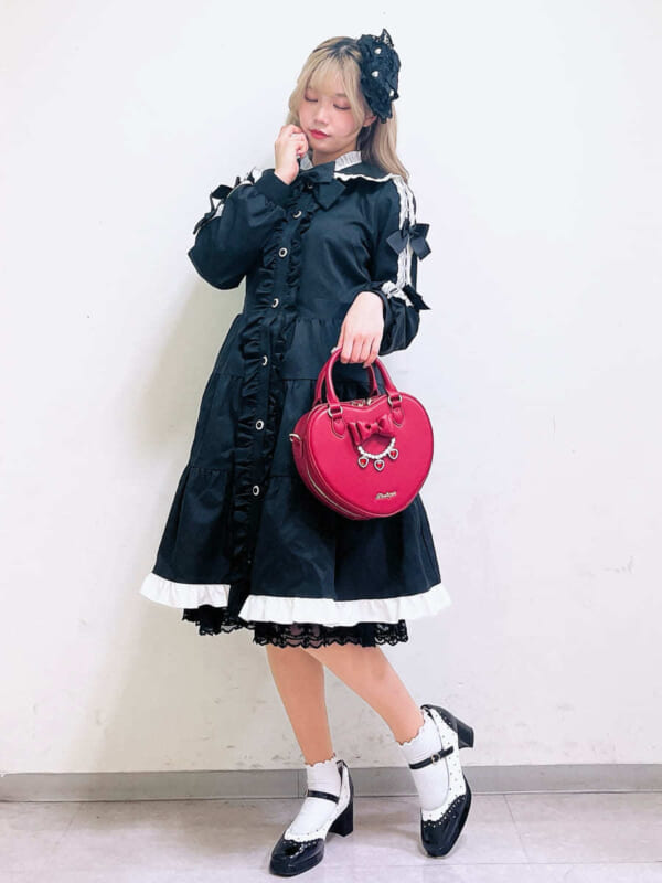 黒色と白色のツートンカラーのワンピース&コートに、ワンポイントで赤色のハートバッグを合わせました♡