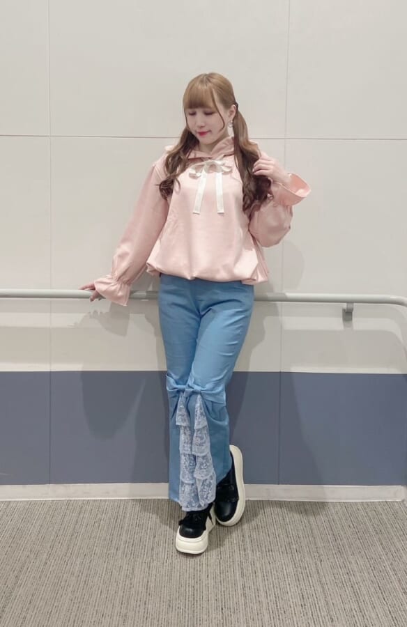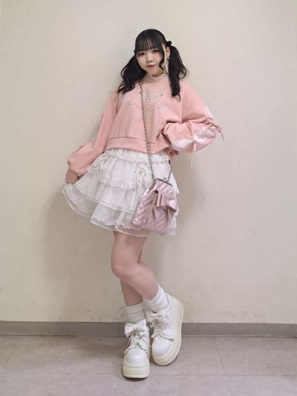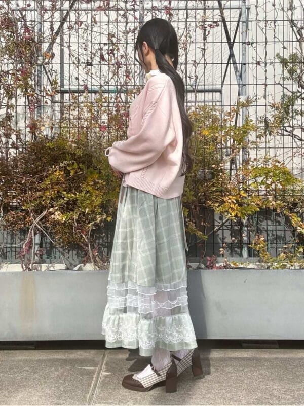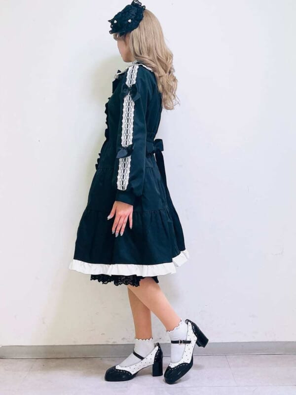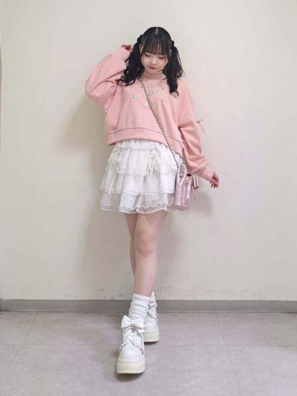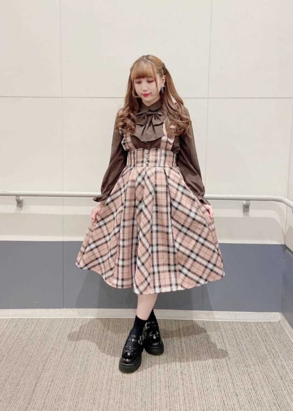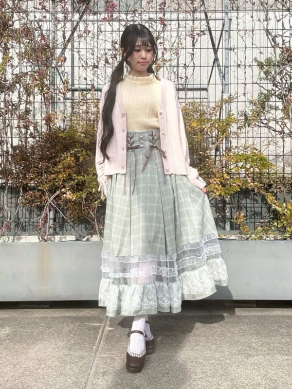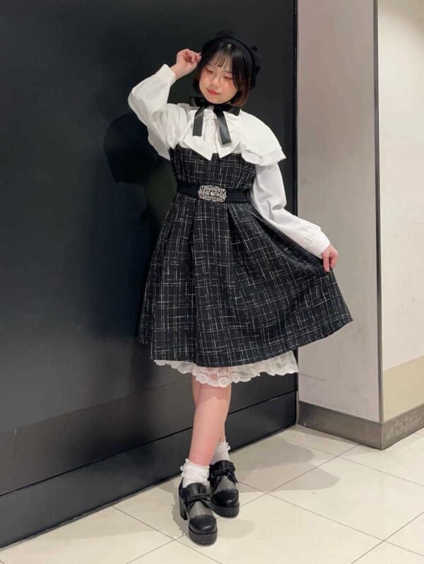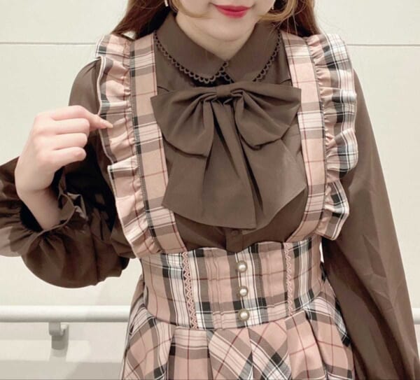 リボンがポイントのブラウスや、フリルのサス付きスカートなど、ディティールにまでこだわったアイテムを着用◎