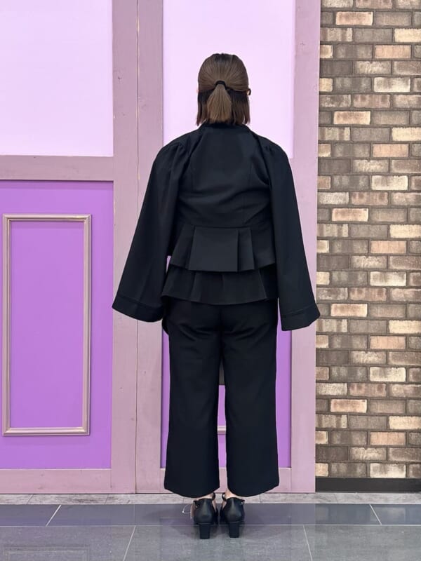 ペプラム風ベルトを外したすっきりとした印象のコーディネートで、セレモニーシーンにもうってつけ!
