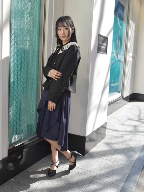 ジャケットのアタッチドカラー使えば、可愛らしい雰囲気にもなりますよ♪