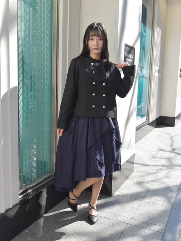 少し個性を加えてくれる連釦のジャケットと、セットアップになるスカートを合わせてオケージョンコーデにするのも◎