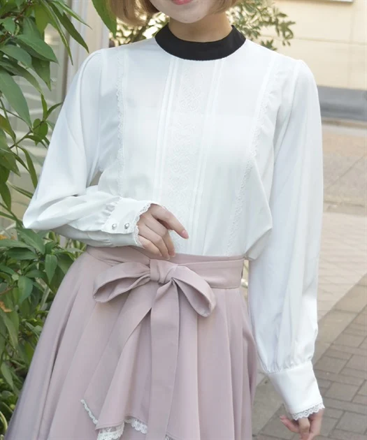 やや広がったフレア袖で、切替にはピコレースを挟み込んだデザイン。
