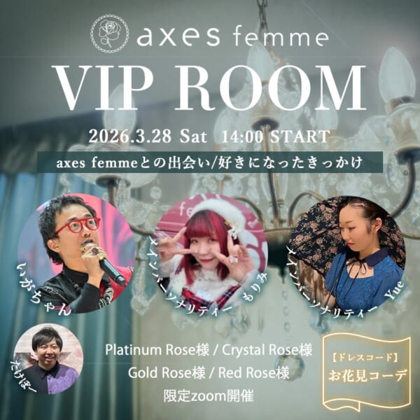 Platinum Rose、Crystal Rose、Gold Rose、Red Roseの皆様限定のオンラインイベント、「axes femme VIP ROOM」♡