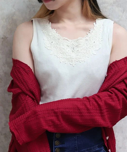 たとえば、吸水速乾モチーフレースタンクのピンクなど同色のインナーと合わせていただくと良いかなと思います◎