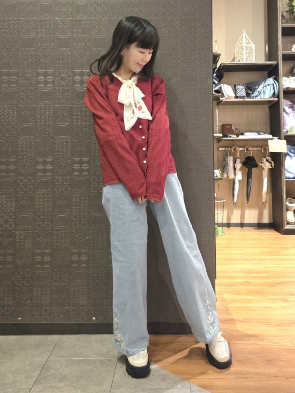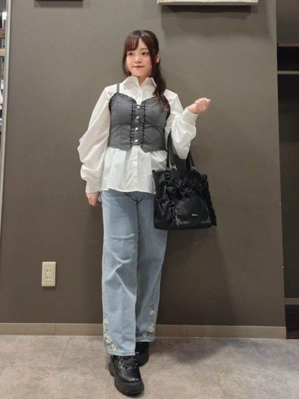デニムパンツと合わせることで、甘すぎない絶妙なバランスに仕上がります♪