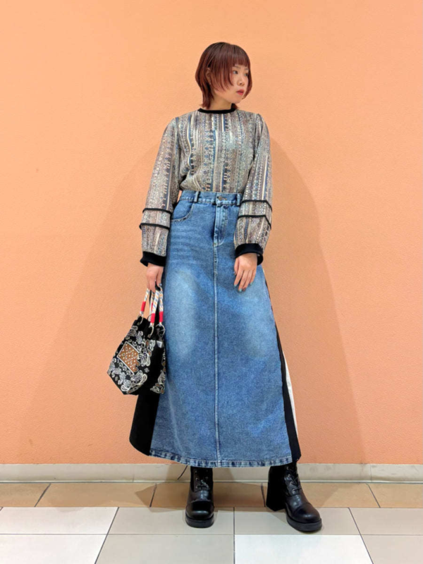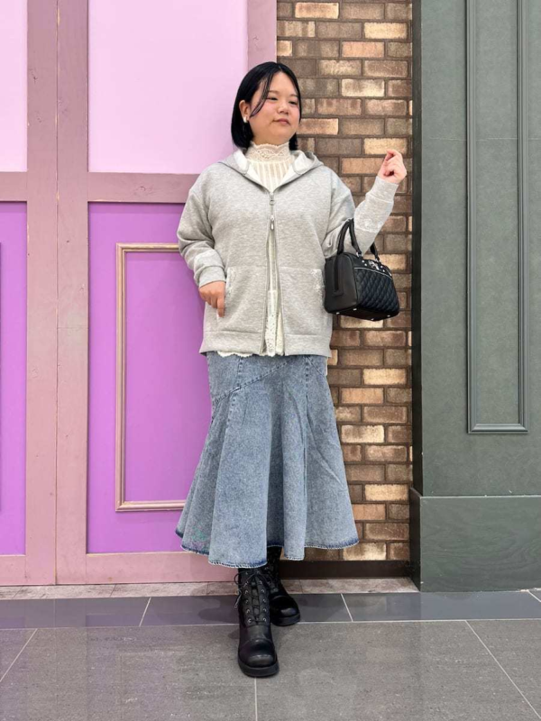 デニムのマーメイドスカートを合わせることで、カジュアルながらも女性らしいラインを演出。