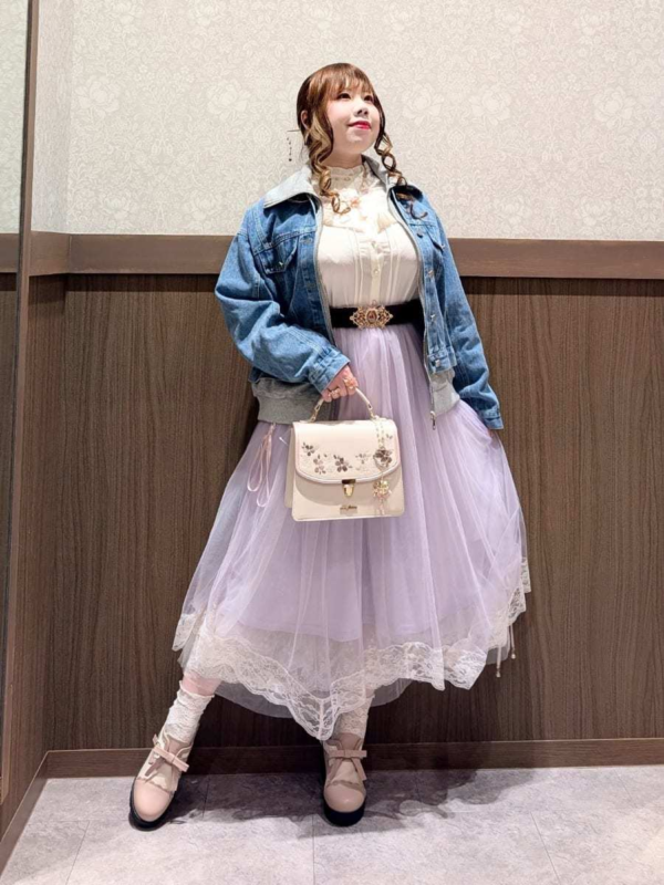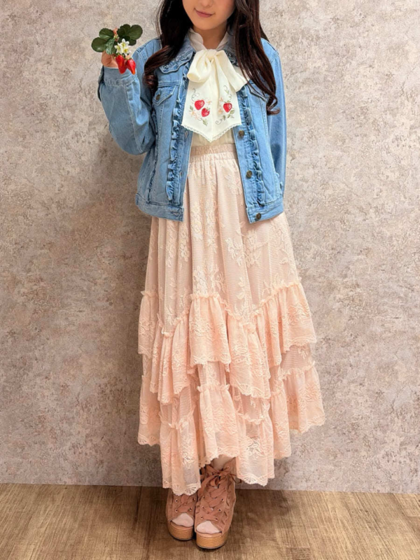 刺繍ブラウス×チュールスカートの王道フェミニンに、デニムジャケットで抜け感をプラス!