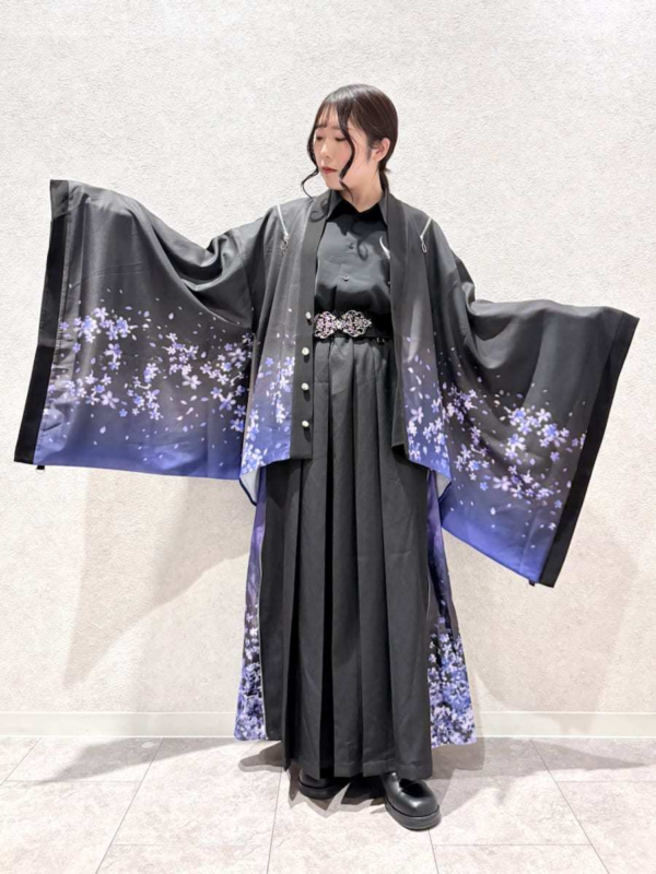 袖を広げると広がる桜のデザインが印象的で、まるで夜桜のような幻想的な雰囲気に◎