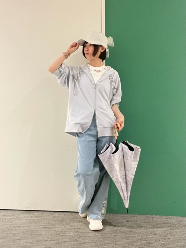 肌触りが抜群に良く、白のパーカーは水色のリボン使いなので甘くなりすぎず爽やかに着こなせます♪