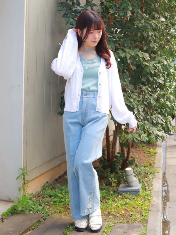 ローズ刺繍のデニムジャケットを羽織ることで、甘さを程よく抑えた大人可愛いバランスに仕上げました◎
