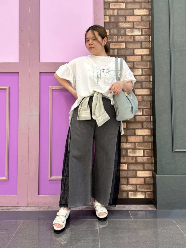 フリルTシャツの中にレースのインナーをレイヤードして、お顔周りの春らしさをアップさせたパンツスタイル!