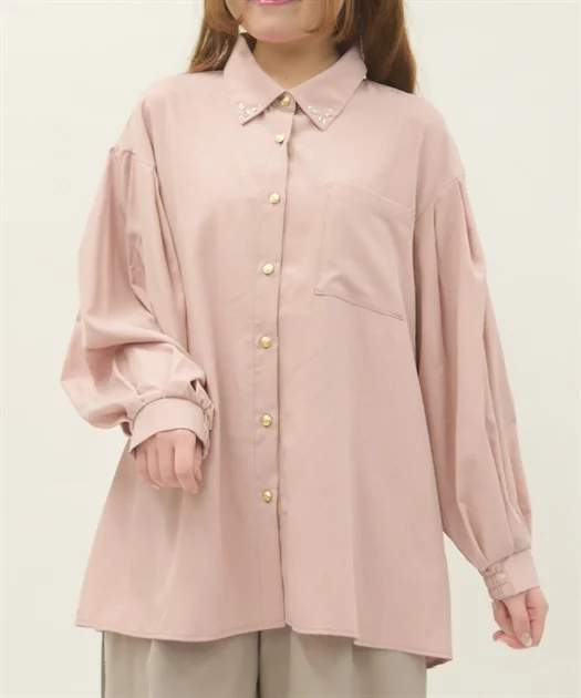 襟元にあしらわれたパールとビジューのきらめきが、お顔周りをパッと華やかに見せてくれる♡