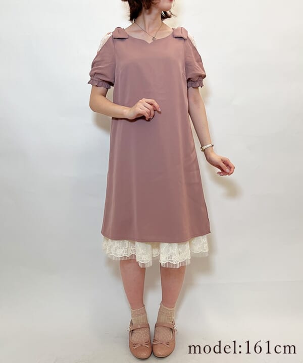 袖スリットにフラワーモチーフの入ったレースを使用したワンピース。