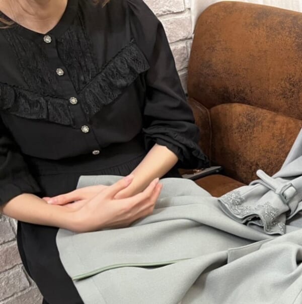 丈はひざくらいまでの長さで、いつもよりちょっと長めです。可愛い系のアイテムは膝下丈にすることが多いのですが、今回はドレッシーに大人っぽく着ていただきたいと思ったので、長めに設定しました。